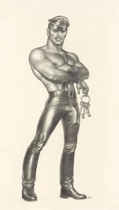 骑摩托车时穿着皮革服装,自然也有保护的意图,但美观在这里更加占据上风:皮衣皮裤的剪裁都越来越修身,好凸显这些男人高大健硕的身材,铆钉、徽章等装饰物也逐渐增多。