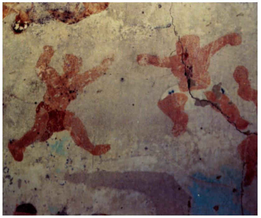 唐 角抵壁画 莫高窟第17窟唐玄宗时期,洛阳的天津桥南面时常有百戏艺人表演“筋斗绝伦”。这是一种爬竿杂技。演员爬到长竿顶部倒立,之后再顺竿爬下,让百姓们一饱眼福。