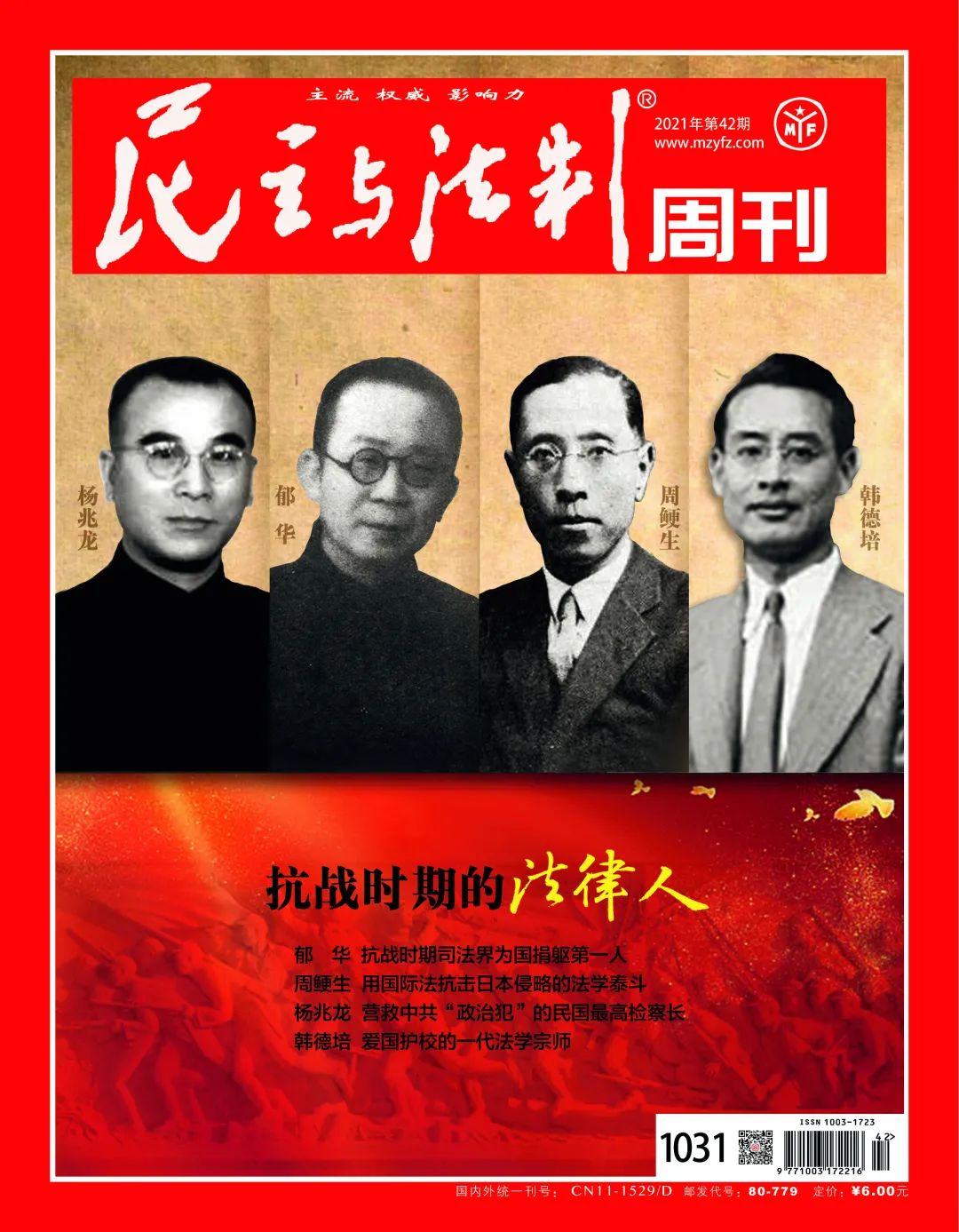 本期聚焦推出郁华、周鲠生、杨兆龙、韩德培等在抗战中不屈不挠的法律人(以出生年月先后为序)的英雄故事,既是为了警醒我们要铭记历史、缅怀先烈、珍爱和平,更是为了告诫每一位中国人:落后就要挨打,要以伟大抗战精神为动力奋力前行,以百倍努力建设我们的国家,实现中华民族的伟大复兴。