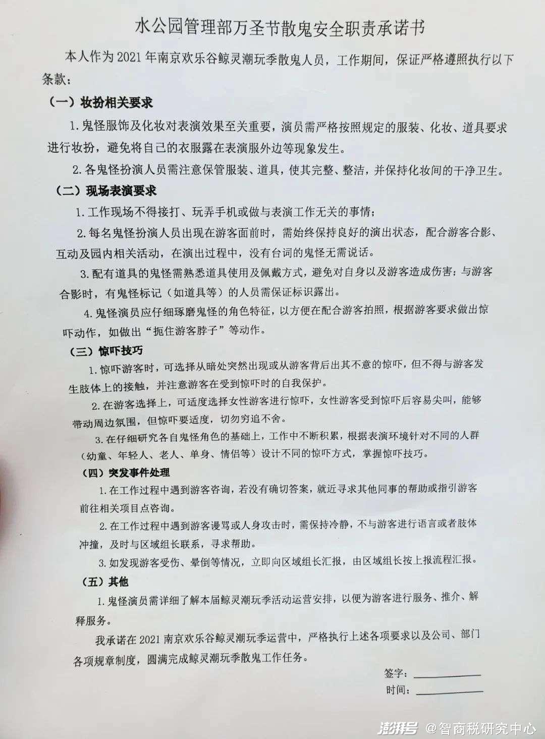 第二天上班,领班给每个人发了一份“水公园管理部万圣节散鬼安全职责承诺书”,要求每个人签署,我认为这是入职前就该签署的,领班说来得早的同事都签了,我问张竹10月初入职前有没有签署,张竹回答:“没有,第一次签。”而领班说张竹签了又忘了,我心想:“既然说他们签过了为什么又拿出来让他们再签一次呢?”但我知道领班大概会怎样搪塞我,便不再说话。