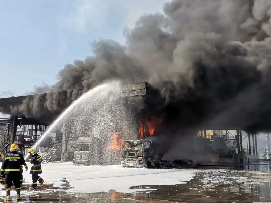 11月14日,广西梧州,某公司一辆油罐车在装矿物油过程中突然起火并引燃周围车辆,现场火势凶猛,比邻储油罐受到威胁。