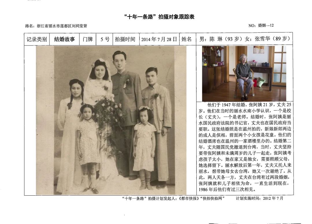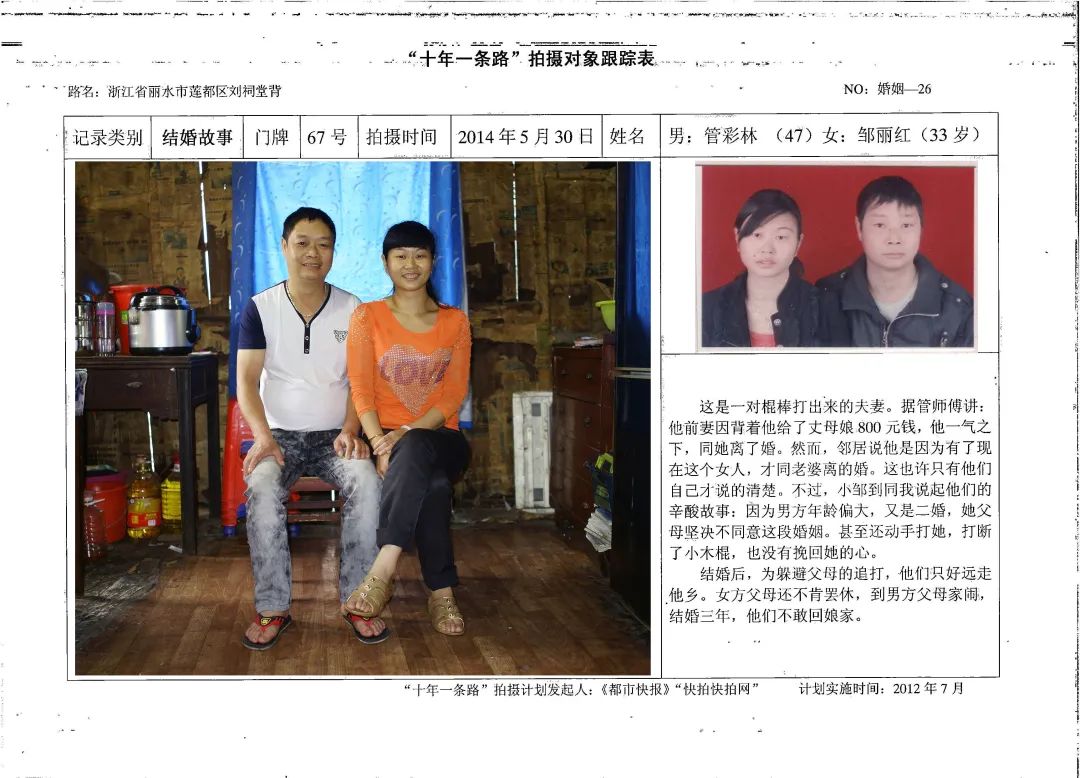 这是我对刘祠堂背婚姻状况调查过程中收获的一个个结婚故事:因为台海关系的紧张,张雪华和丈夫结婚一年就分离,两岸遥望一晃数十年;已经离婚的黄增其夫妇为了两个女儿中考,重新生活在一起,离婚不离家;管彩林夫妇的组合遭遇女方家庭反对,但是棍棒并没有打散这对夫妻,反而更加坚定了他们守护在一起的决心。他们的结婚故事,是人生酸甜苦辣的一个个鲜活样本。