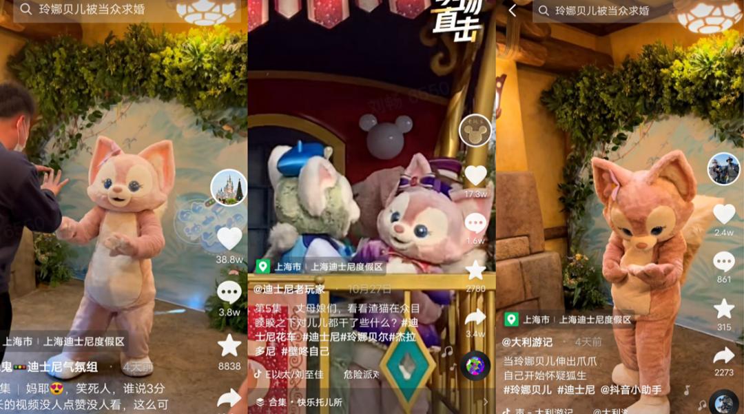 当然,这些片段都被他们自己用手机记录得清清楚楚。将视频发布在抖音等平台后,该游客运营的“小野马在迪士尼”账号如愿获得了不错的流量,向玲娜贝儿求婚的视频甚至引起了全网的关注与讨论。