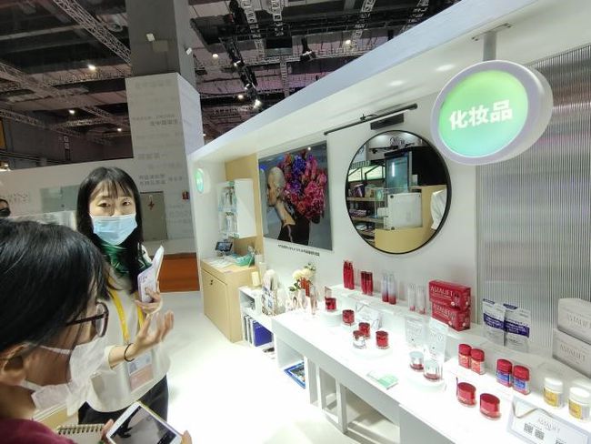第四届进博会现场,富士胶片展台一隅吸引了很多女性参观者,原来她们在试用富士胶片的ASTALIFT艾诗缇护肤品。