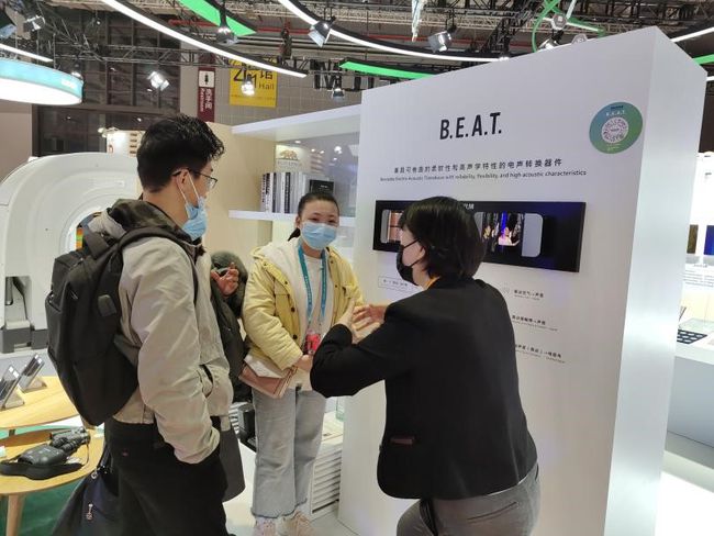 在富士胶片“多彩生活”展区,可弯折的创新型电声转换膜“B.E.A.T.” (Bendable Electro-Acoustic Transducer)在此次进博会带来“中国首秀”,引来参观者的广泛关注。