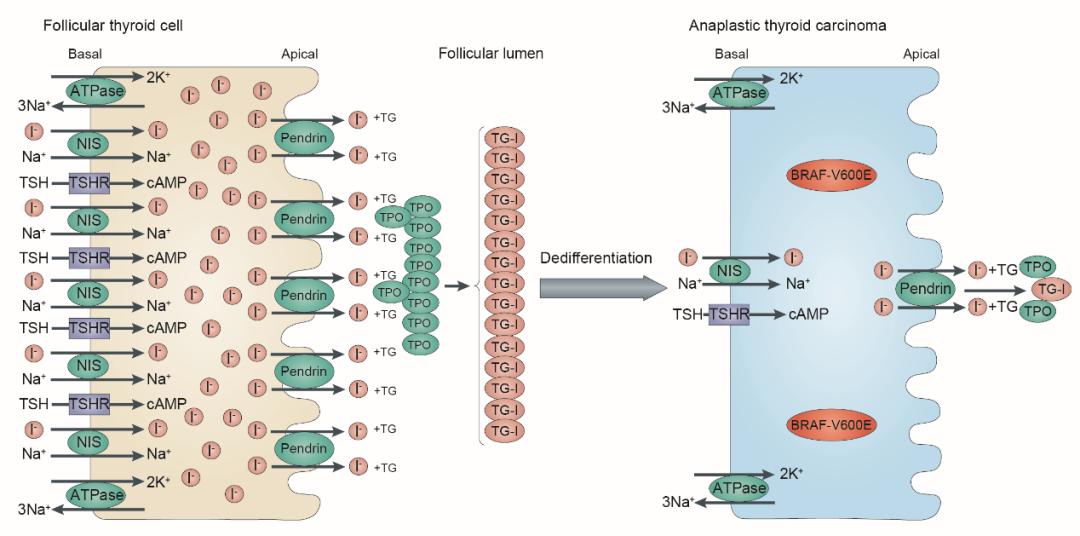 甲状腺癌是最常见的内分泌系统恶性肿瘤,居我国恶性肿瘤发病率第八位,并呈逐年增长的趋势【2】。2020年中国甲状腺癌新发患者达221093人。甲状腺未分化癌(anaplastic thyroid carcinoma,ATC)是恶性程度最高的甲状腺癌亚型,其预后极差,中位生存时间仅5个月【3】。甲状腺组织浓聚碘的特性是放射性碘-131治疗的基础。遗憾的是,由于ATC处于高度失分化状态,参与碘摄取及代谢的相关基因表达显著下调,尤其是甲状腺滤泡细胞表面钠-碘转运体(sodium/iodide symporter,NIS)的表达缺失,使得ATC细胞无法有效摄取放射性碘【4】(图1)。目前临床尚无有效诱导ATC再分化的药物,探索诱导ATC再分化的方法是甲状腺癌研究领域的热点。