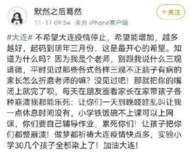 ▲11月17日(昨天),自称老师的大连网友“默然之后蓦然”发文,不希望大连疫情停止、希望越多越好,引起网友愤怒。网传的截图显示,这名网友自称是一名小学老师,每天被各式各样的家长折磨,一点休息时间都没有。现在孩子只能在家上网课,她在朋友圈看到家长辅导作业到崩溃,自己特别开心。因此,她希望大连的疫情久一点。17日下午,记者看到,“默然之后蓦然”的微博账号已经注销。17日下午2时许,大连市公安局相关工作人员告诉记者,他们已经关注到此事,相关部门正在开展工作。如有结果,会进行公开发布。