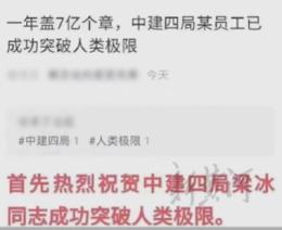 ▲近日,一篇题为《一年盖7亿个章,中建四局某员工已成功突破人类极限》的自媒体推文引发网友热议。11月17日(昨天),记者致电中建四局贵州投资建设有限公司,该公司工作人员回应称,文章是今年9月30日在公司内部的一个官方微信公众号发布的,因为撰稿作者在写的时候把万和亿的单位搞错,发布之前没有进行严格审核。“目前公司已经对该事件进行了核实,‘7亿次’系笔误。”该工作人员表示,目前公司正在开会处理这个问题。