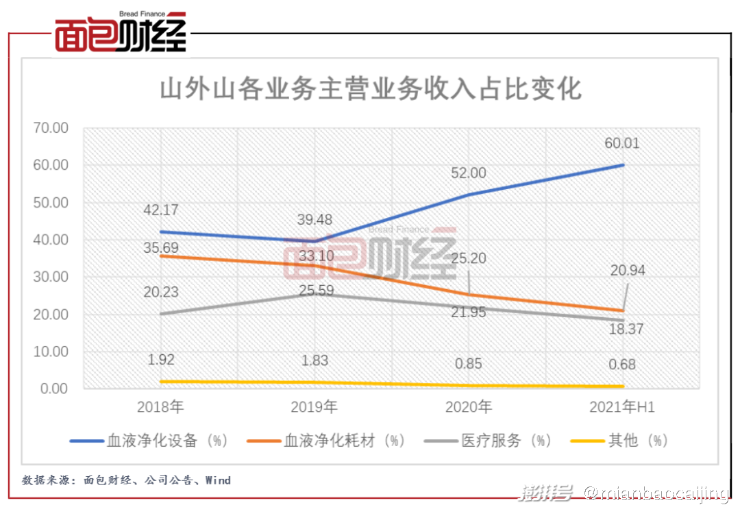 2021年上半年,血液净化设备是公司最主要的收入来源,主营业务收入占比约为60.01%。其次分别为血液净化耗材和医疗服务业务,主营业务收入占比分别为20.94%和18.37%。观察2018年以来公司各业务的主营业务收入占比变化发现,除了血液净化设备业务,其他业务的主营收入占比均呈下降趋势。