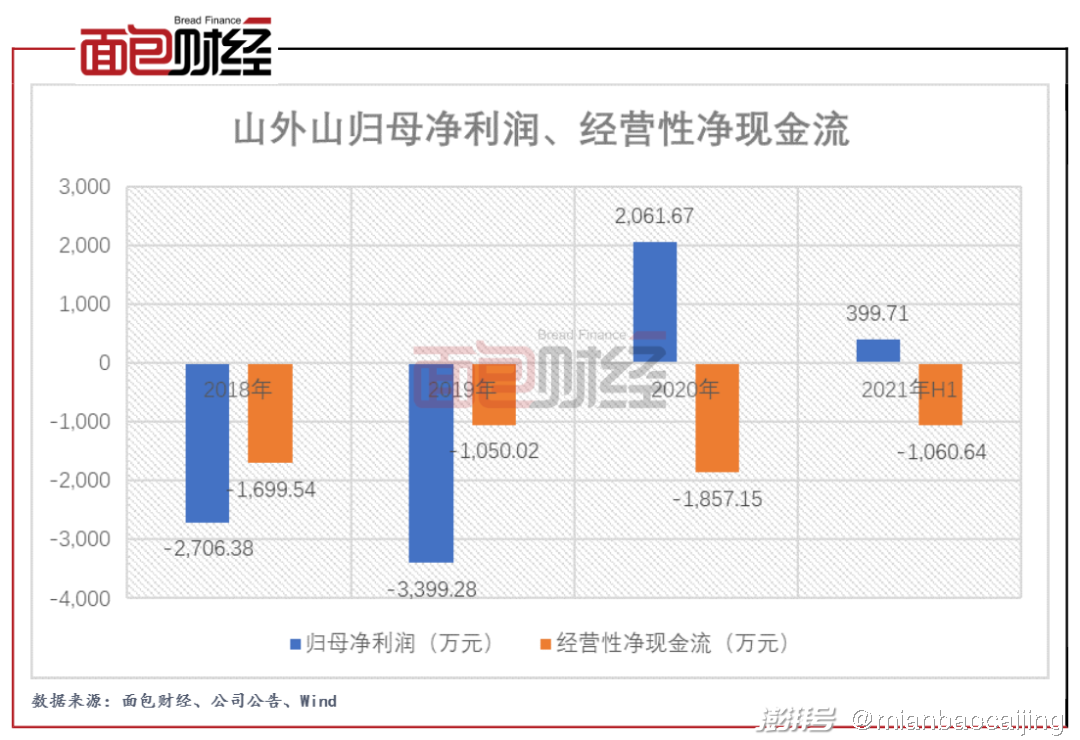 图2:2018年至2020年H1山外山营业收入、归母净利润及扣非后归母净利润但值得注意的是,尽管山外山已于2020年实现扭亏为盈,但公司的经营性净现金流持续表现较差。数据显示,公司2020年、2021年上半年的经营性净现金流分别为-1857.15万元和-1060.64万元,均大幅低于同期的归母净利润。