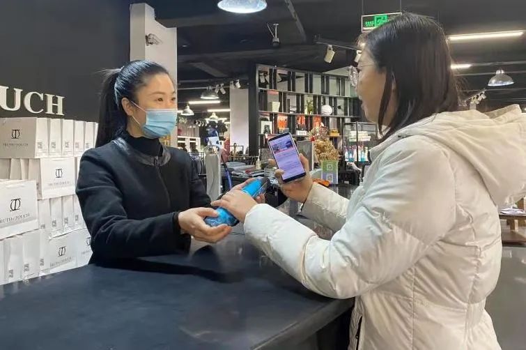 图为山东省烟台市一职工购物时出示“智慧工会”图片来源:工人日报客户端