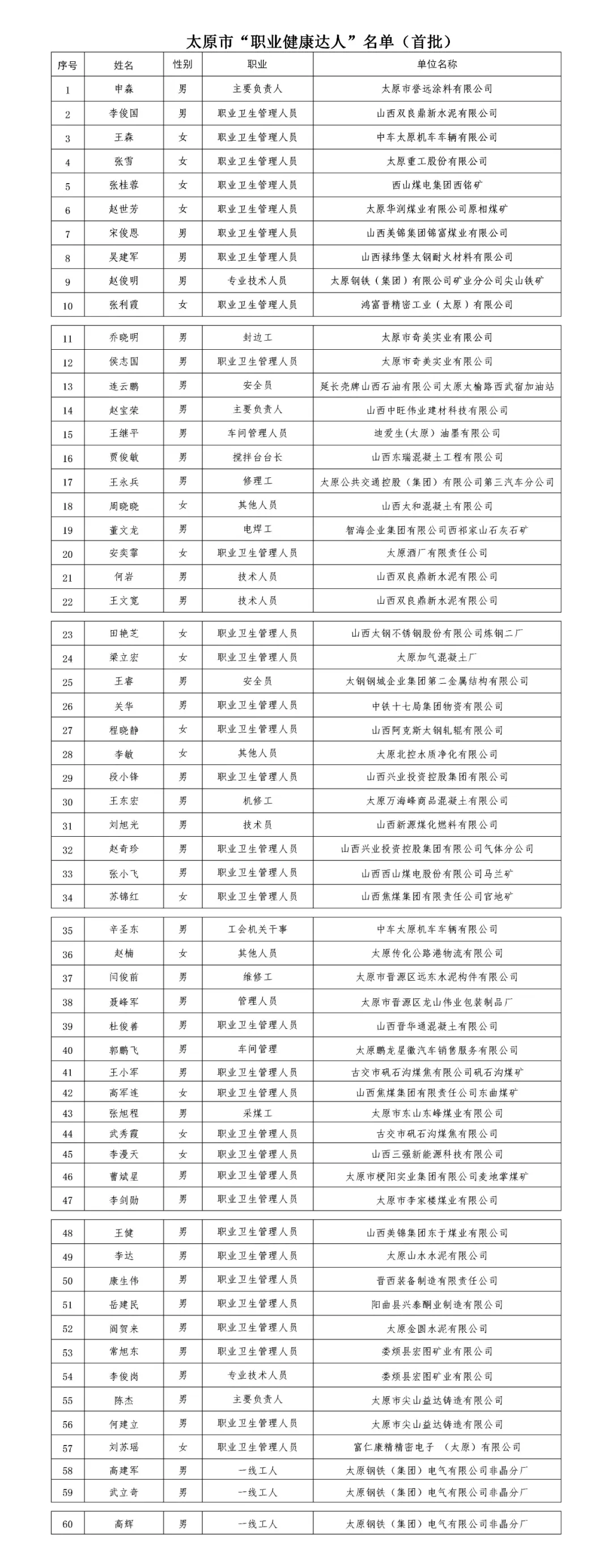 为扎实推进健康中国·太原行动,进一步推动用人单位落实主体责任,加强职业健康管理,切实保护劳动者健康权益,太原市卫生健康委员会、太原市总工会在全市开展了争做“职业健康达人”活动。各县(市、区 )高度重视、精心组织、广泛宣传、积极动员,把评选活动与健康科普、《职业病防治法》宣传周、职业健康知识“进企业、进机构、进学校、进社区、进乡村”、传播作品征集、“安康杯”竞赛等工作相结合,营造出全社会关心关注劳动者健康的良好氛围。经过用人单位申报、县(市、区)级审核和市级复核,最终确定太原市首批“职业健康达人”60名,并推荐10名候选人参加省级“职业健康达人”评选。