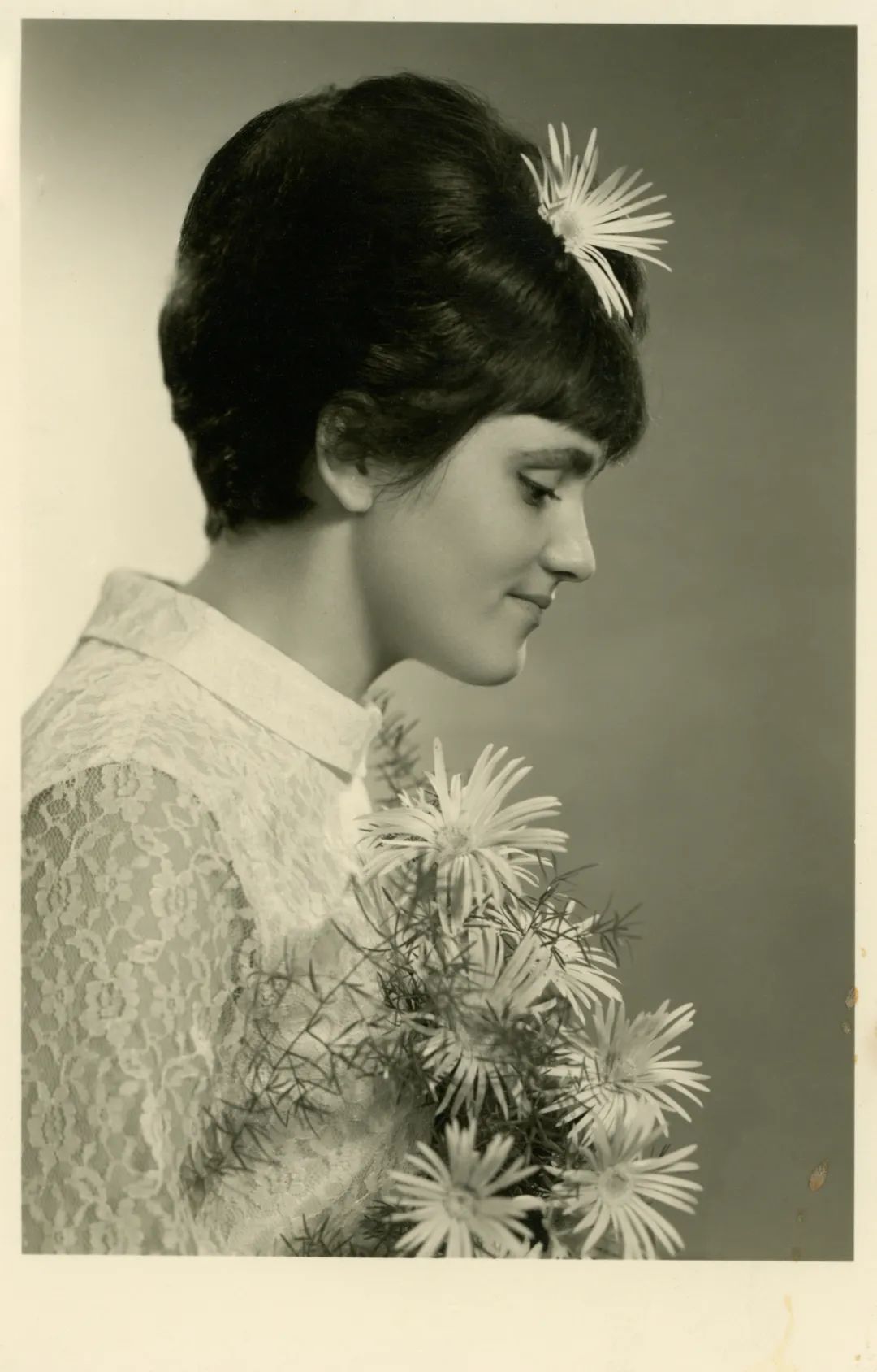 这些老照片有其历史价值,但它们的视觉语言对我来说同样重要。哪怕你不知道这些老照片的背景,都能看出有一个小女孩,被鲜花包围着;看到年轻女子在参加圣餐礼;看到她成年、在婚礼上的样子。