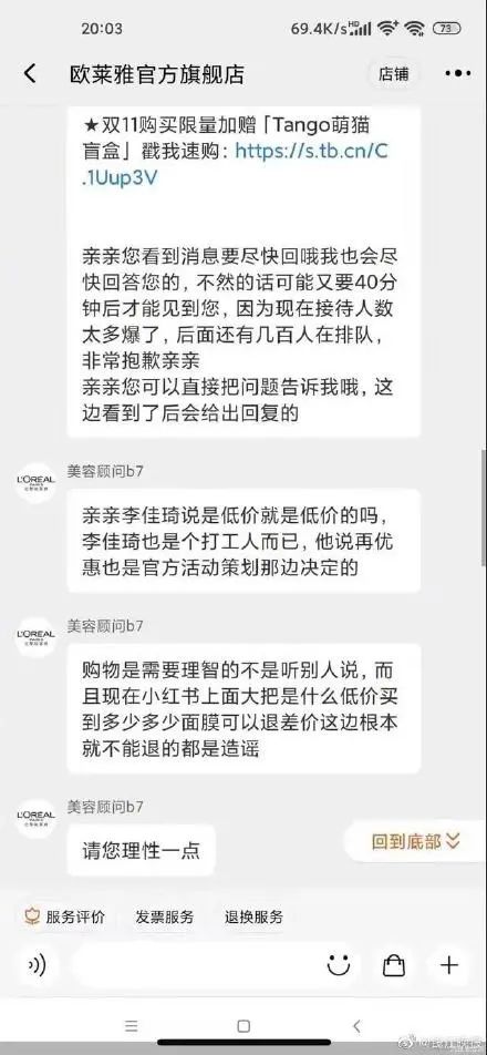消费者与欧莱雅官方客服的聊天截图消费者小焦告诉蓝鲸记者,她是在15号左右找到了欧莱雅官方客服,“客服不理人,最后是88VIP因为我信用良好给退了差价。”实际上,到小焦维权时,欧莱雅已下架了原商品链接,导致消费者无法在平台上直接进行保价服务。
