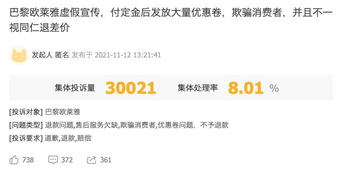关于欧莱雅的集体投诉 / 黑猫投诉 数据截至18日14时随着舆论发酵和关注升级,17日晚间,李佳琦、薇娅先后在微博就差价一事发表声明进行回应。两大主播声明内容基本一致,称已与巴黎欧莱雅品牌方进行多轮交涉,但目前尚未达成一致。若24小时后欧莱雅还不能给出解决方案,将由直播间承担对消费者的补偿。此外,李佳琦与薇娅目前已暂停与巴黎欧莱雅品牌方的一切合作。