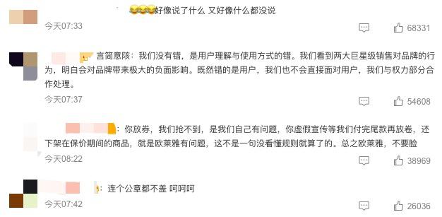 相关网友评论 / 微博截图对于这个道歉,多数网友和消费者似乎并不领情。与此同时,中消协点名批评欧莱雅物流停滞,“1号付的尾款11号还在北京。” 看起来,欧莱雅明目张胆背弃的,恐怕不止是薇娅李佳琦两大主播。