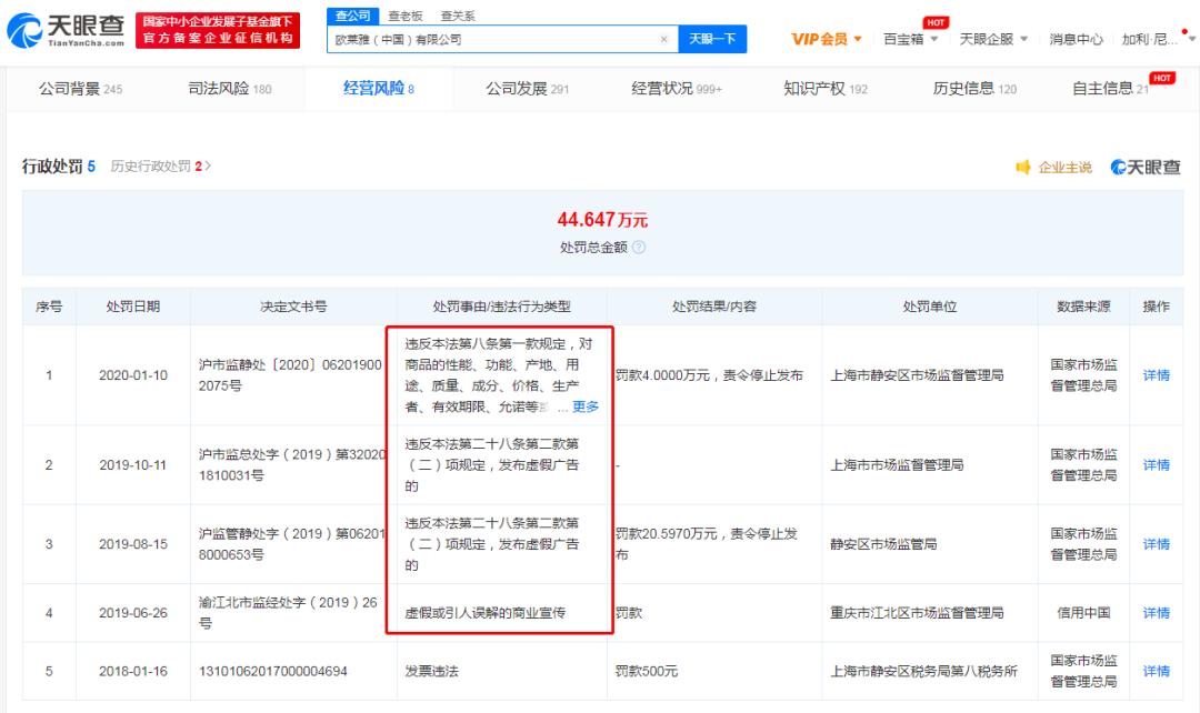 欧莱雅相关行政处罚 / 天眼查繁荣背后,这已不是欧莱雅第一次陷入“虚假宣传”了。据天眼查App显示,成立于2000年的欧莱雅(中国)有限公司曾多次因虚假广告、虚假或引人误解的商业宣传被行政处罚,历史被处罚总额达44.6万元;此外其还涉及多项买卖合同纠纷案件。