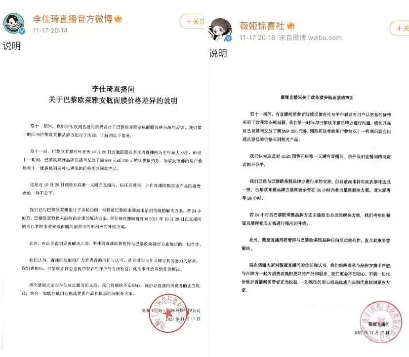 事件逐渐发酵。11月17日晚间八点左右,李佳琦、薇娅纷纷发表声明,若是24小时欧莱雅品牌方没有给出合理解决方案,则由直播间兜底进行相应补偿。并宣布在事件未解决之前,与欧莱雅方暂停合作。