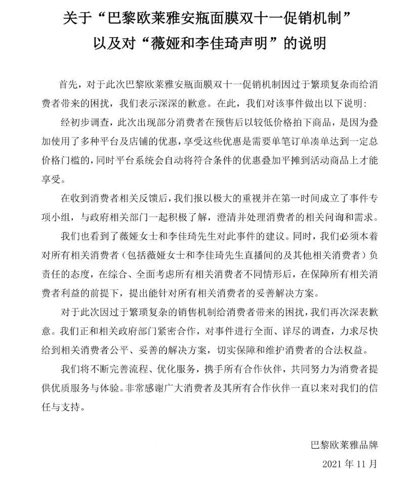 欧莱雅则在18日凌晨两点发博,对“双十一促销机制过于繁琐复杂”而带来困扰致歉,声明中提到,部分消费者,是因为叠加使用了多种平台及店铺的优惠才享受的低价。而此份声明被网友形容是“深谙废话文学,说了跟没说一样”,并被吐槽“连个公章都没有盖”。