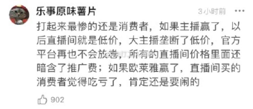 有用户表示,“如果主播赢了,以后直播间是低价。大主播垄断了低价,官方平台再也不会放券,所有的直播间价格里面还暗含了推广费;如果欧莱雅赢了,直播间买的消费者觉得吃亏了,肯定还是要闹的”。