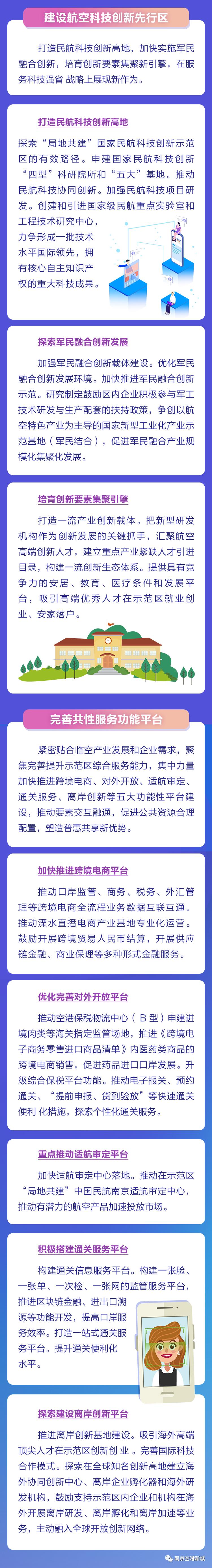“总体发展规划”全面把握示范区作为全省连接世界、接轨国际的高等级对外开放平台作用,打造具有世界聚合力的双向开放枢纽。一方面,强化禄口机场核心枢纽地位。通过加快枢纽机场建设、做强基地航空公司、完善航线网络结构、建设邮政核心口岸等措施,推动国际航空枢纽建设再上新台阶。另一方面,畅通示范区开放合作通道。以跨境电商平台等5大共性服务功能平台为载体,拓展示范区开展国际业务、参加国际竞合的开放渠道,培育开放发展新优势。
