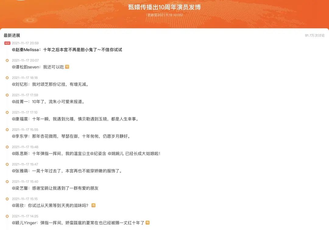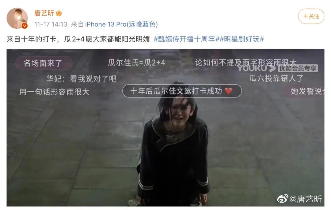 11月17日,众参演明星纷纷发博纪念#甄嬛传开播十周年#。