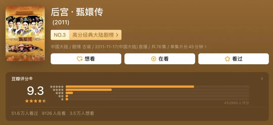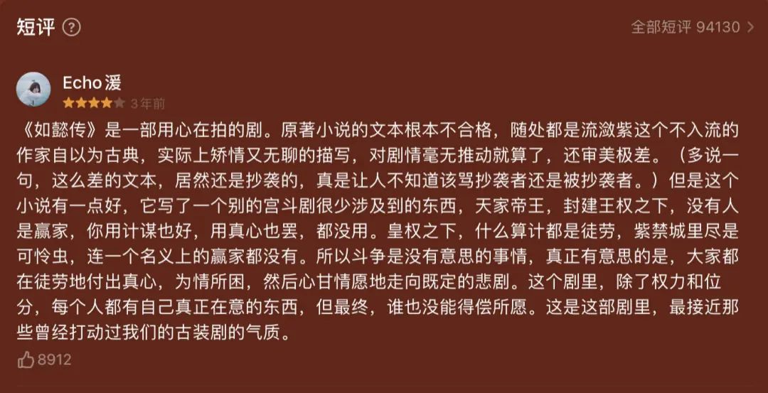即便后来,某二流报纸指责《甄嬛传》宣扬“黑化”与“学坏”,以及诸多历史学家、历史爱好者、李诚儒之流的伪专家搬出起居注实录来批评《甄嬛传》不尊重历史,也很难阻挡观众老爷对这部剧的喜爱之情。