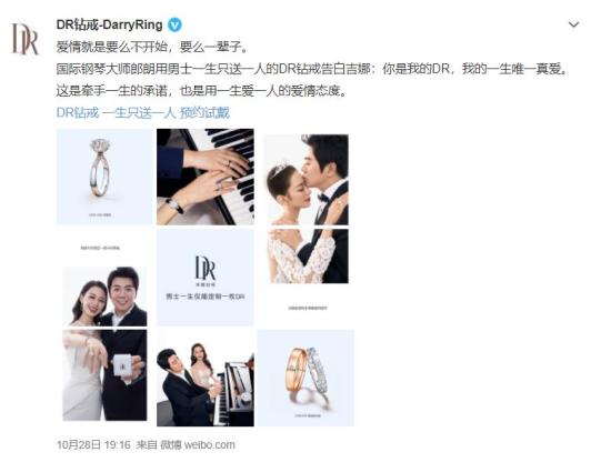 拿代言人郎朗吉娜来说,郎朗曾在爱人生日时献上DR钻戒,独创告白“你是我的DR”,带火了一波讨论。在李承铉戚薇、吴京谢楠、罗家英杜玉明、苏炳添夫妇等其他“模范”明星夫妻的婚礼上,亦出现了DR钻戒的身影。