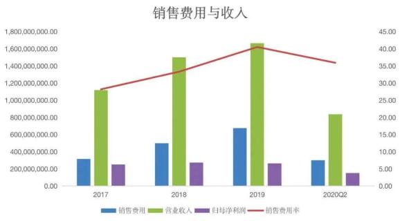 2018年 - 2020年,DR每年销售费用在总营收中的占比已经达到了33.32%、40.51%和29.58%。而反观其宣传投入,2018~2020年,迪阿股份宣传推广费用率分别为9.31%、8.29%和5.57%。行业同期的平均宣传推广费用率分别为3.81%、3.72%和4.86%。