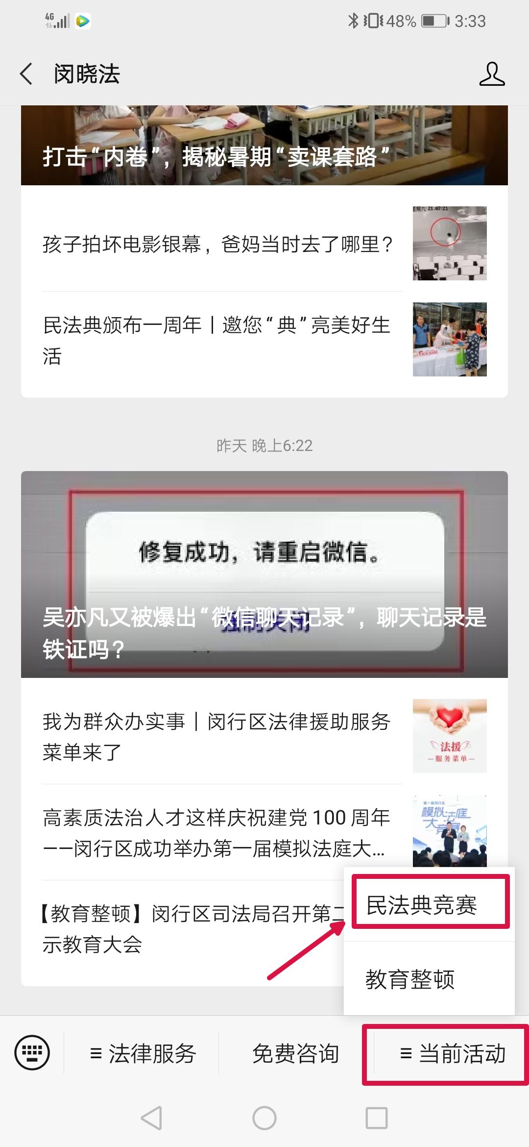 答题方法:关注“闵晓法”微信公众号,在手机下方子菜单“当前活动”中找到“民法典竞赛”进入答题页面即可答题。