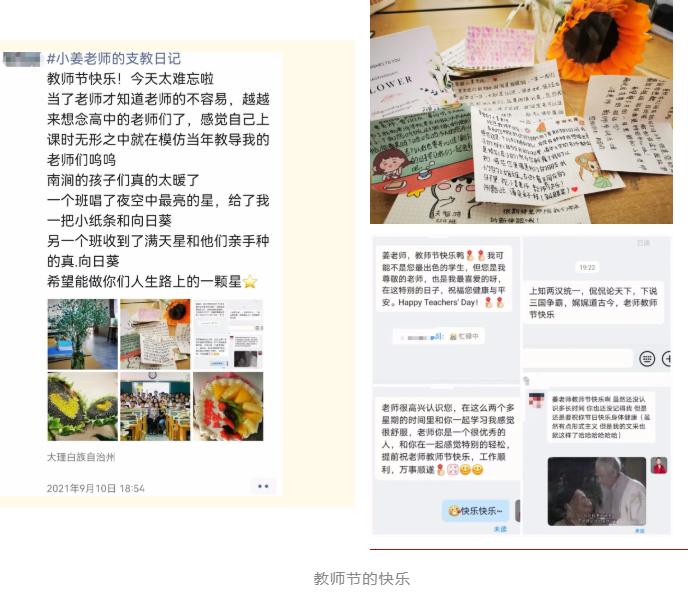 现在我在云南大理的南涧,成为了两个班的历史老师,辅导着高三的几个学生,课余也会去周边的小学上科学课。这里的孩子真诚善良,身上充满了阳光。只是因为身处大山,消息闭塞,所以不知道外面的天空什么样。这里有太多向曾经的我一样的孩子,因为身处茫茫大山,所以不知道青云之志是什么样;因为家庭经济困难,所以不敢相信自己还有重写命运的力量;因为努力没有效果,甚至放弃了受教育的机会。闲暇时我常常跟他们聊天,把我在莱西一中、在大学的故事讲给他们,告诉他们任何时刻都不要看轻了自己,每个人都有无穷的潜力,只要你相信,只要你愿意去做。我也会在课前给他们放各种纪录片和清华的视频,引起他们对远方的向往。我很欣慰,他们中有的人的成绩已经有了起色,有的人已经在勇敢地畅想未来,去外面看看。这把从莱西一中带过来的种子,已经被我撒在了这里,悄悄发芽。