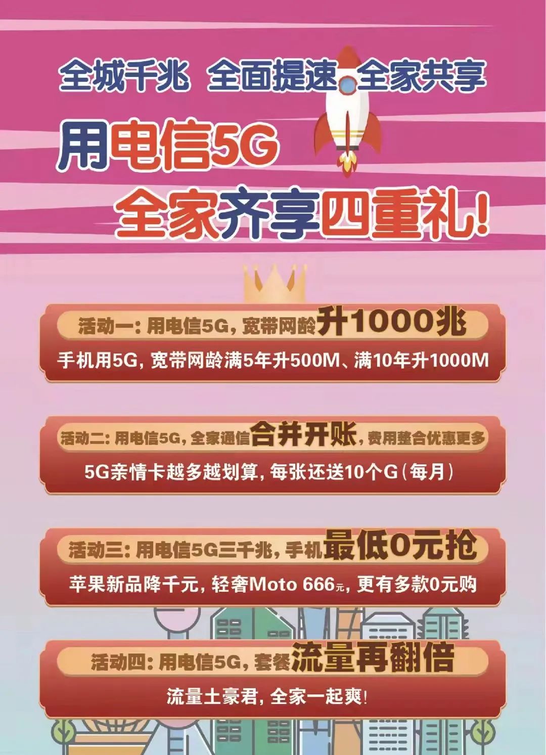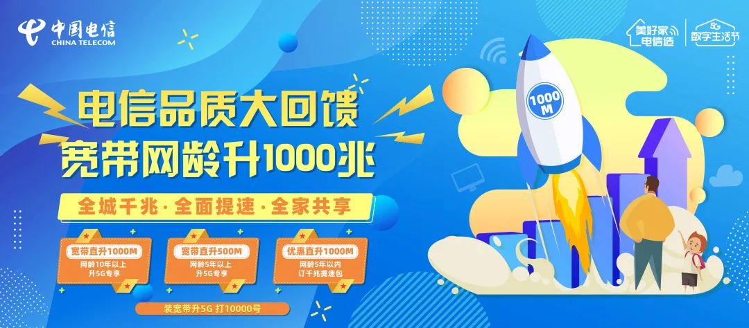 ● 使用电信5G,网龄10年以上,免费升1000M● 使用电信5G,网龄5-10年,免费升500M