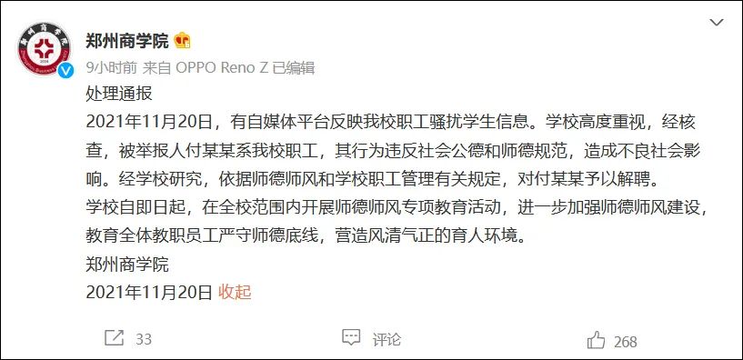 11月21日,@郑州商学院 发布处理通报称,2021年11月20日,有自媒体平台反映我校职工骚扰学生信息。学校高度重视,经核查,被举报人付某某系我校职工,其行为违反社会公德和师德规范,造成不良社会影响。经学校研究,依据师德师风和学校职工管理有关规定,对付某某予以解聘。