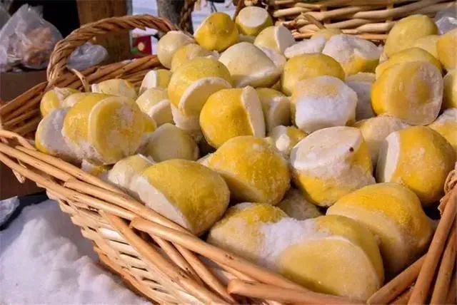 冻粘豆包在卖冻货的市场,或是东北农家,到了冬天,一抹亮丽的黄色,就是另一个人间美味。到了深秋或者初冬,许多农家就开始制作粘豆包,烀豆子,做馅料,软糯的黄米面包上豆馅,有的还用玉米叶做底,防止粘连,一个个“黄胖子”就成了最纯正的东北味道。