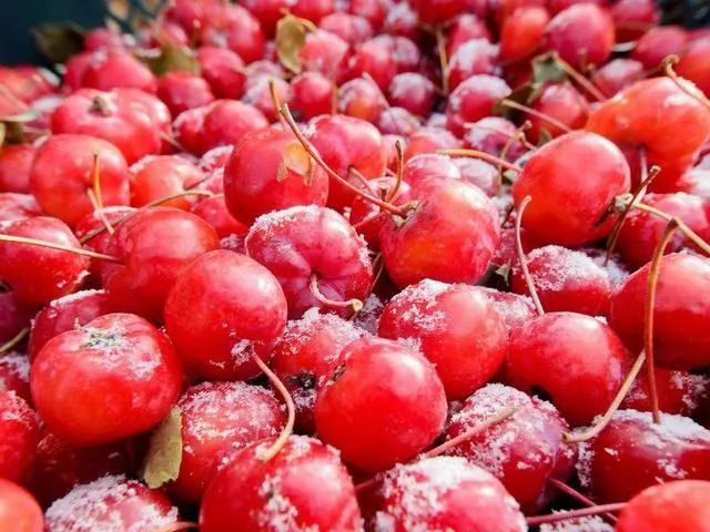 冻花红冻花红在冻货里面也是非常具有代表性的,颜值够高,红彤彤的,很容易勾起你的食欲。其实冻花红就是冷冻的海棠果,酸甜可口,开胃一流。