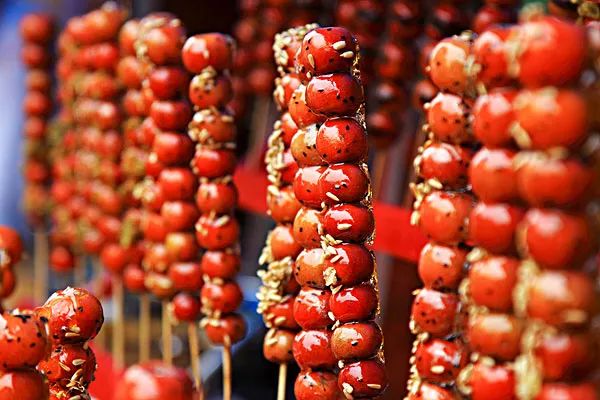 冰糖葫芦冰糖葫芦和白雪皑皑的冬天,是绝佳CP。红彤彤的山楂果整齐地穿在竹签上,待冰糖熬制成透明鲜亮的液体,把山楂在汤汁里均匀地蘸上一圈,晶莹剔透的冰糖葫芦就闪亮登场了!