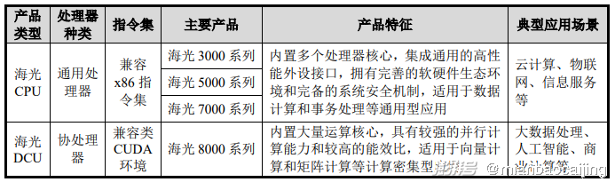 海光信息主营业务是研发、设计和销售应用于服务器、工作站等计算、存储设备中的高端处理器,产品包括海光通用处理器(CPU)和海光协处理器(DCU)。