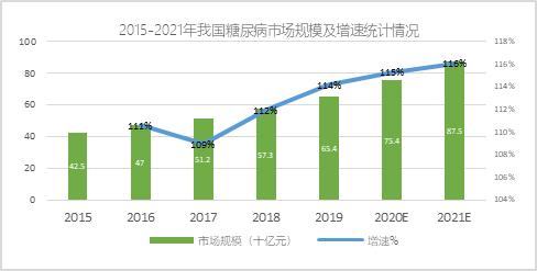 中国庞大的患者基数将支撑广阔的市场空间。中国作为全球糖尿病第一大国,患者数量达1.298亿,其中二型糖尿病占比超过90%。据资料统计,2019年我国二型糖尿病患病人数为1.274亿人,随着人口老龄化,预计2021年我国二型糖尿病患病人数将达到1.347亿人;糖尿病市场规模从2015年的425亿元增长至2019年的654亿元,随着创新抗糖尿病药物的研发,市场规模也将不断扩大。此外据测算,我国共有1312万人有必要使用动态血糖监测产品。(如图1)
