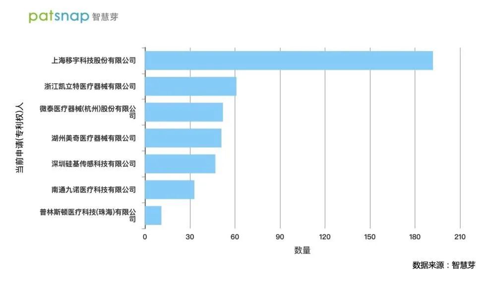 通过智慧芽全球专利数据库,笔者发现上述7家企业均有较强的技术保护意识,均在产品上市前进行了专利申请和布局。其中上海移宇科技股份有限公司申请专利量最多,达192件;浙江凯立特医疗器械有限公司申请专利63件、湖州美奇医疗器械有限公司申请专利51件、深圳硅基传感科技有限公司申请专利47件、南通九诺医疗科技有限公司申请专利34件、微泰医疗器械(杭州)股份有限公司申请专利量24件、普林斯顿医疗科技(珠海)有限公司申请专利13件。申请专利总量达400多件,此外笔者发现以上公司保护的技术点基本都围绕着持续血糖监测技术和产品改进,说明以上公司产品线较为单一,均主要以血糖监测技术及产品为主要研究方向。(如图3、图4)