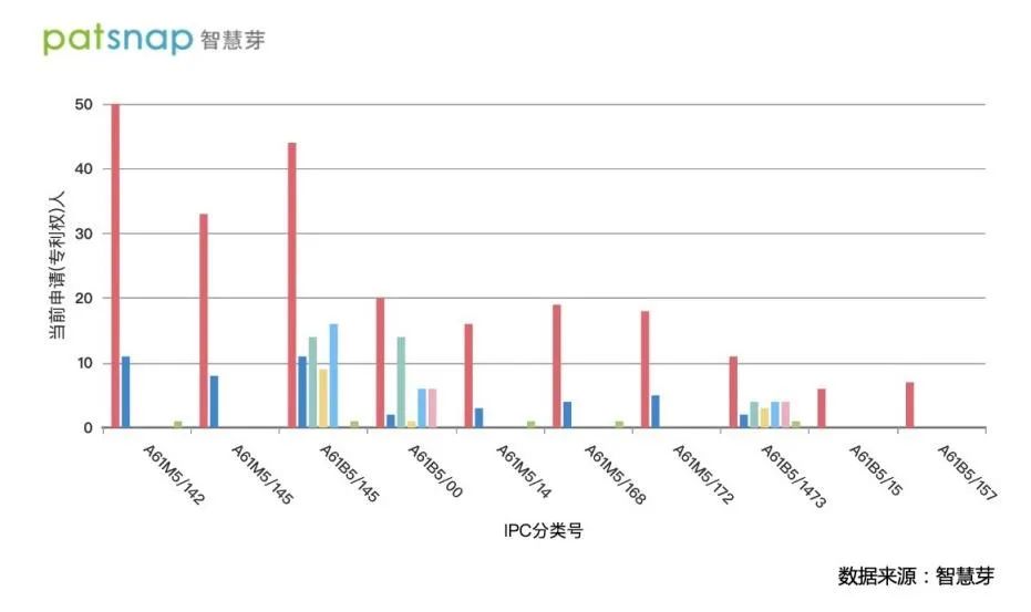 CGM在技术层面壁垒很高,涉及多学科交叉,如传感器外膜设计、校准算法、酶固定化技术等。对于这些国内企业来说,产品在突破基础技术难题的同时,也各有自己的特点。通过智慧芽数据库也可以直观看出各家产品均有各自的技术特点(如图6)。比如上海移宇科技的产品覆盖多个技术点如可抛式胰岛素泵、一步式全集成体液采样分析等(技术对应A61M5/142、A61M5/145、A61B5/145等);九诺医疗在动态血糖监测电路及其控制方法(技术对应A61B5/00)等方面改进较突出;美奇医疗的技术改进则较侧重通过云端大数据智能实时动态监测体内血液数据系统(技术对应A61B5/145)。