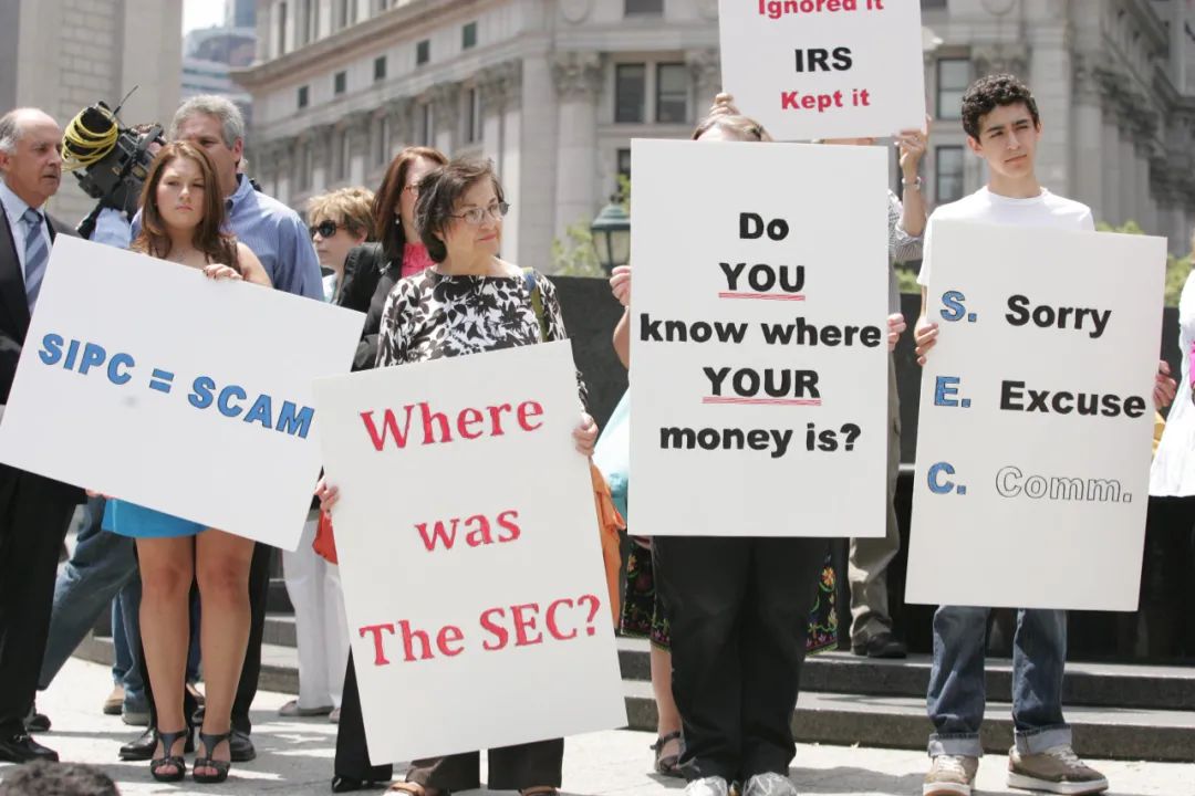 2009年6月29日麦道夫被判处150年徒刑,抗议者于纽约城联邦法院外(来源:usatoday.com)