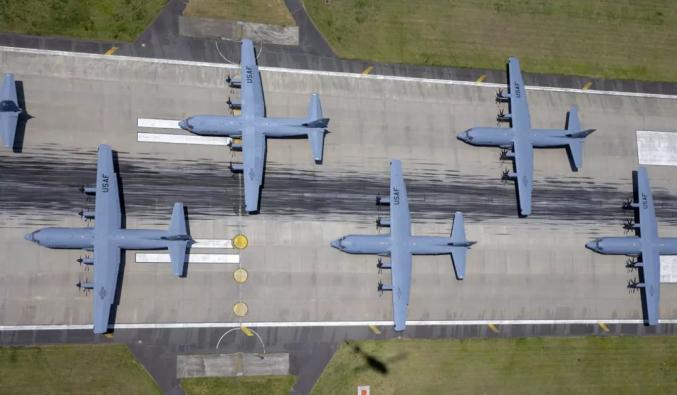 从空中望去,一字排开的12架C-130运输机非常壮观。