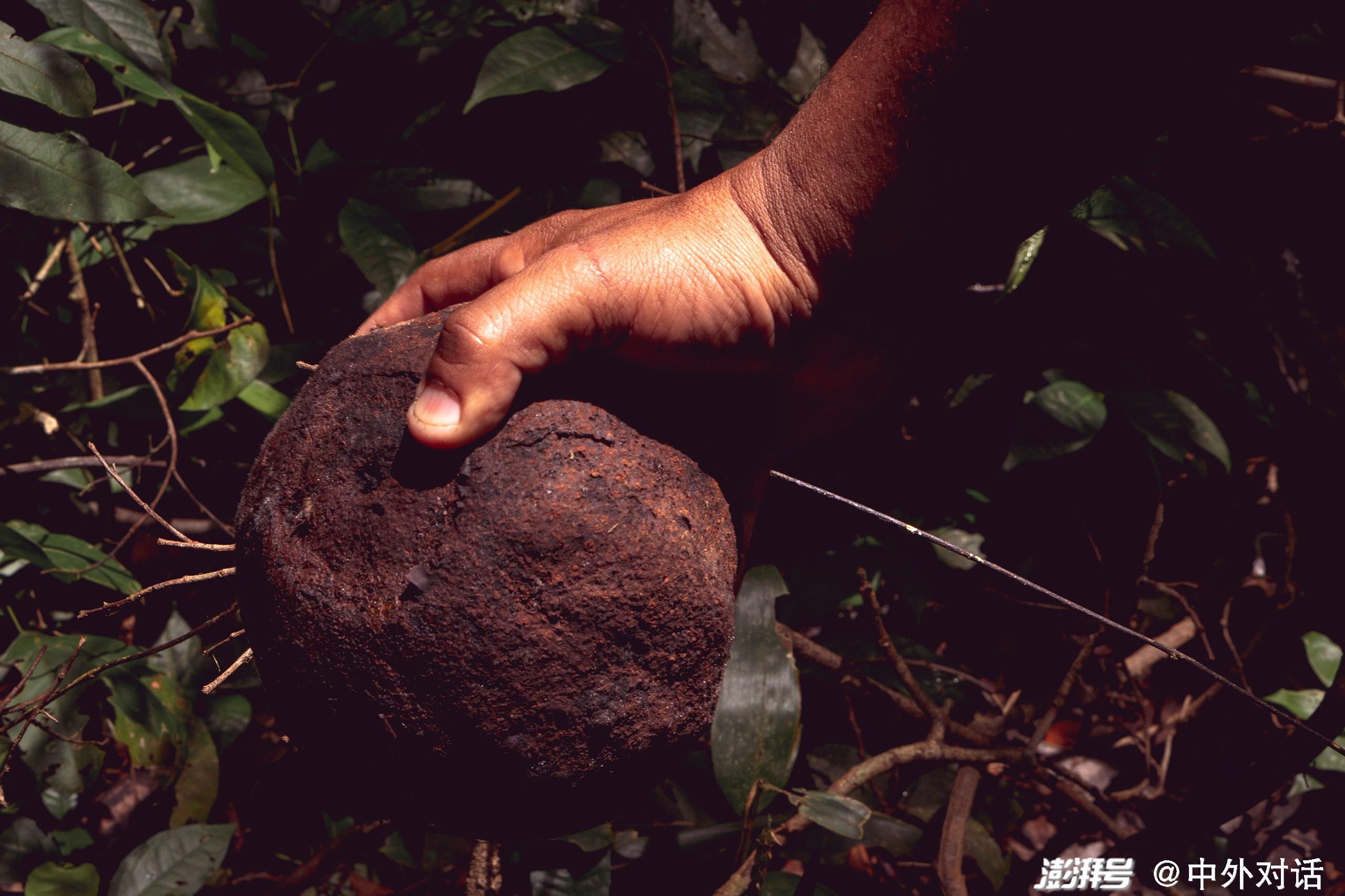 巴西坚果的果实包裹在坚硬的外壳中,成熟后会像椰子一样从树冠落下。采集者需要具有敏锐的眼光,才能找到隐藏在其他植物中间的巴西坚果。图片来源:Flávia Milhorance