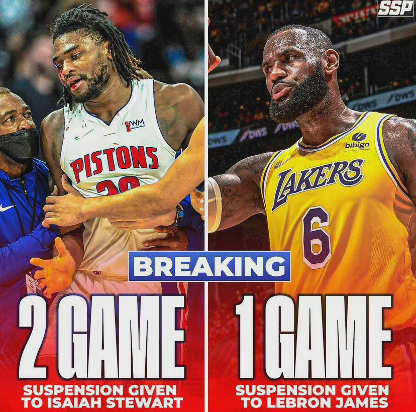 斯图尔特禁赛两场,詹姆斯禁赛一场。