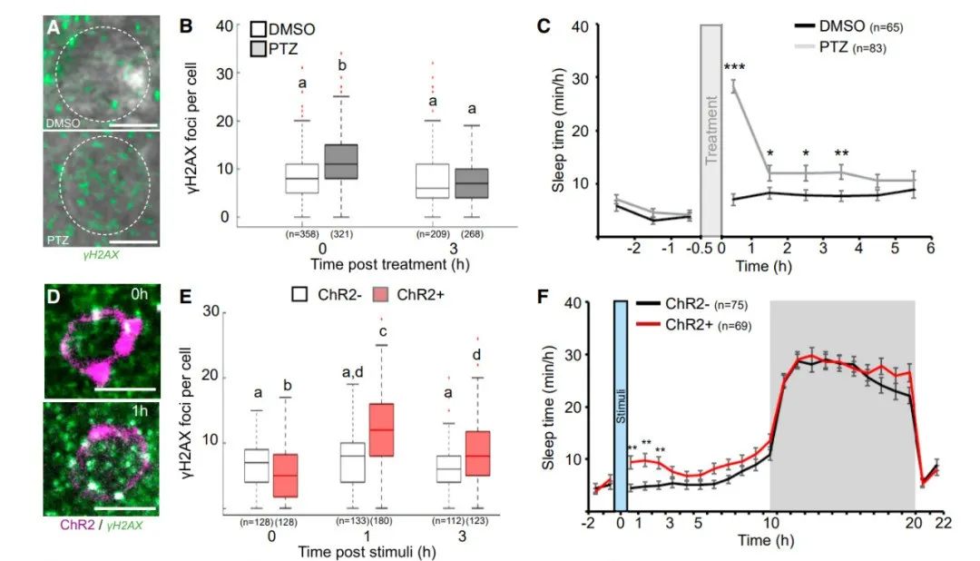 研究团队进行了一系列实验,试图确定DNA损伤的积聚是否可能是体内平衡压力和随后睡眠状态的驱动因素。科学家们首先将斑马鱼作为动物模型,他们可以利用斑马鱼来尝试识别细胞睡眠驱动因素,并理解睡眠在恢复单个神经元水平的核稳态中的作用。