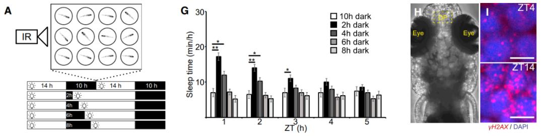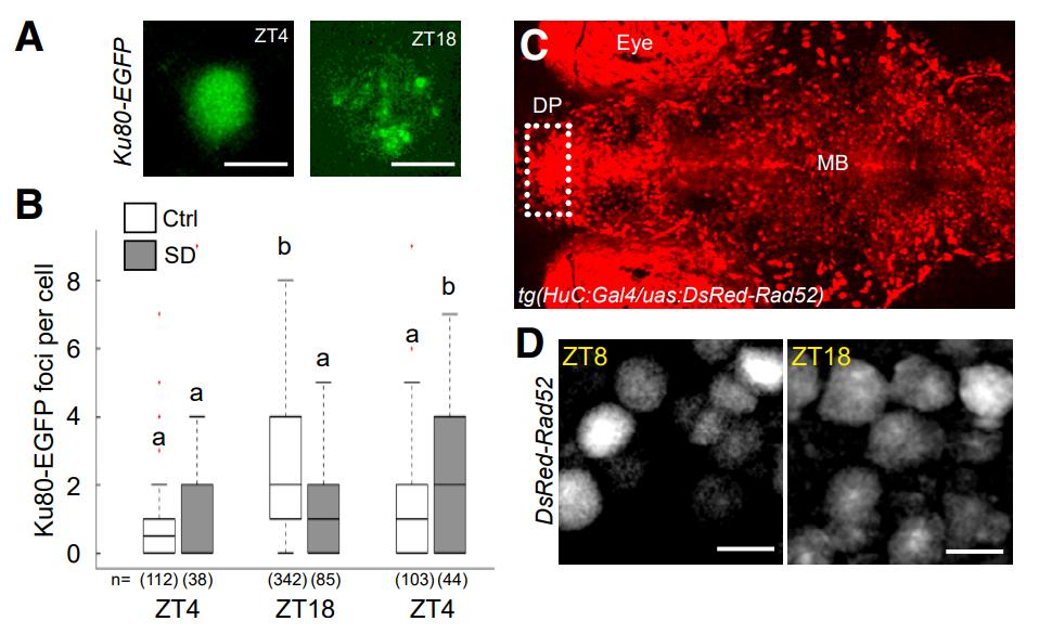 在睡眠和DNA损伤诱导后,Rad52和ku80的修复活性增加在确定了累积的DNA损伤是驱动睡眠过程的力量后,研究人员想进一步确定斑马鱼需要睡眠的最小时间。和人类一样,斑马鱼对光线的干扰也很敏感,所以可以通过光照来打断睡眠,从而控制斑马鱼的睡眠时间。