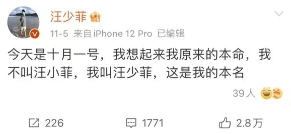 11月5日,汪小菲在微博公开表示,已将名字改回“汪少菲”。