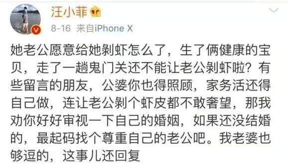 汪小菲也进入了“护妻模式”:“她老公愿意给她剥虾怎么了,生了俩健康的宝贝,走了一趟鬼门关还不让老公剥虾啦?”