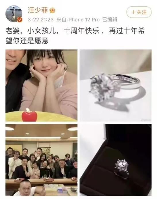 今年三月,两人结婚十周年时,汪小菲在微博晒出了庆祝婚姻十周年送给大S的某品牌钻戒,并带话题#汪小菲又送大S鸽子蛋#。有网友发现,该戒指品牌的负责人正是汪小菲的好友。