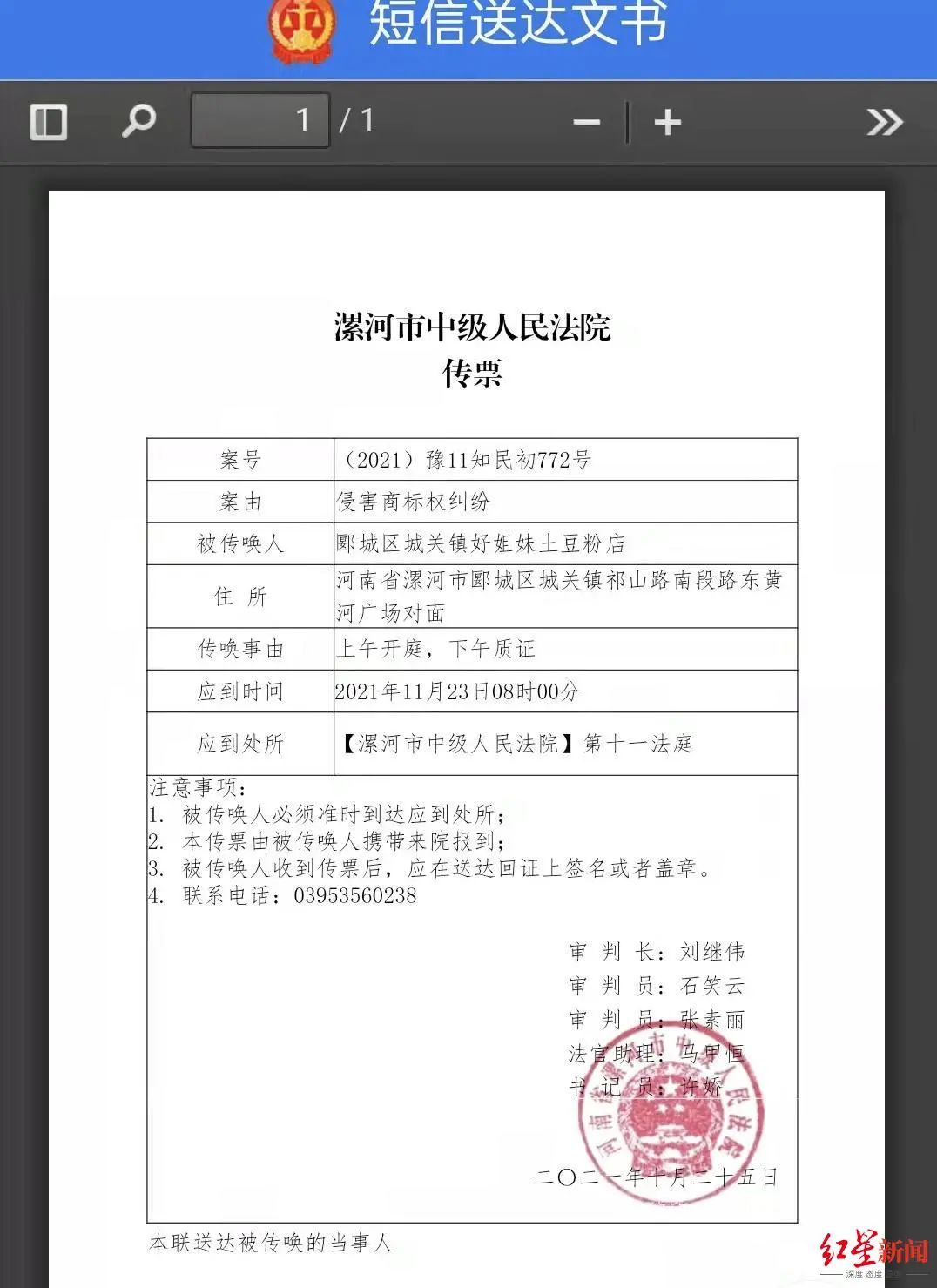 河南漯河郾城区城关镇好姐妹土豆粉店便是被告之一。该餐馆负责人李女士告诉红星新闻记者,今年10月26日她便收到了协会起诉的短信,起诉的原因就是商标侵权纠纷。